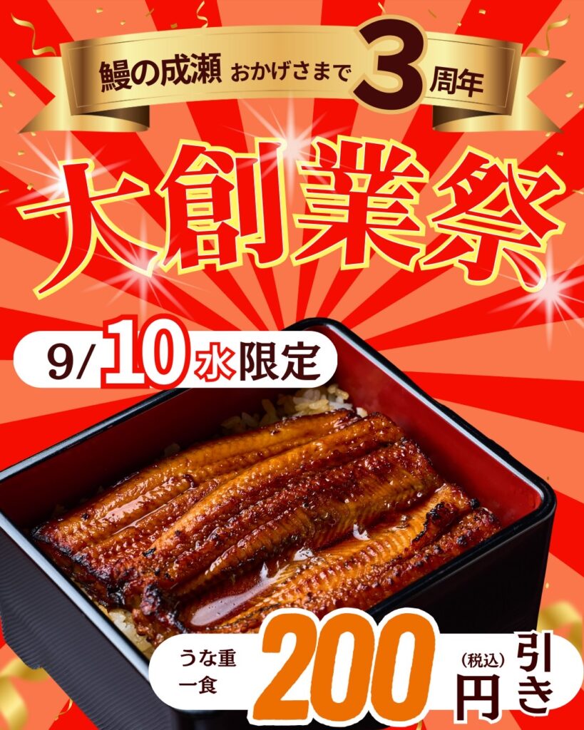 鰻の成瀬 9月10日(水)大創業祭!