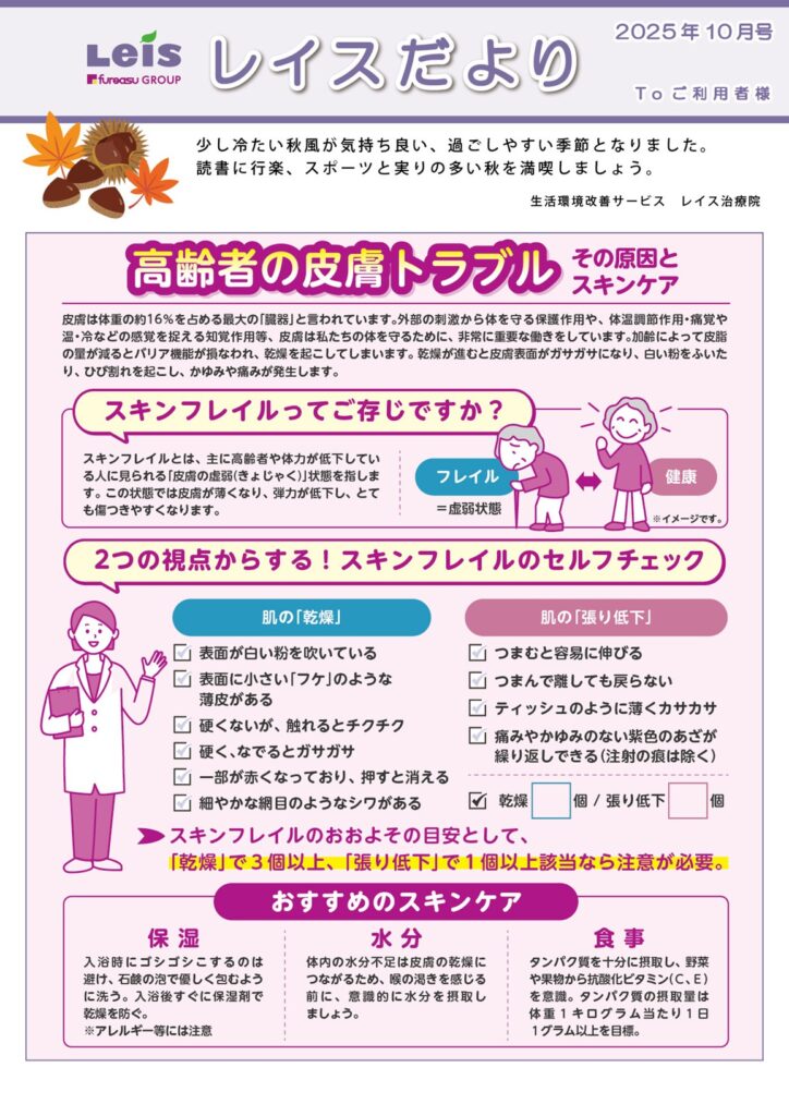 レイスだより10月号 2025年10月1日 最終更新日時 : 2025年10月3日 plusthank レイスだより10月号 富士市、富士宮市の訪問医療マッサージレイス治療院 富士・富士宮より 秋風が気持ちよい季節となりました。皮膚トラブル「スキンフレイル」ってご存じですか?セルフチェックにご活用ください。 LINE公式 レイス治療院富士・富士宮