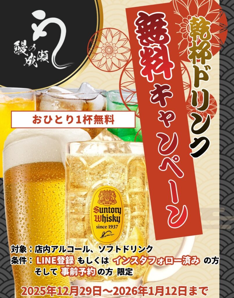 鰻の成瀬 乾杯ドリンク無料キャンペーン&年越し鰻