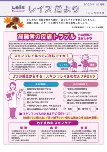レイスだより10月号 富士市、富士宮市の訪問医療マッサージレイス治療院 富士・富士宮より 秋風が気持ちよい季節となりました。皮膚トラブル「スキンフレイル」ってご存じですか?セルフチェックにご活用ください。