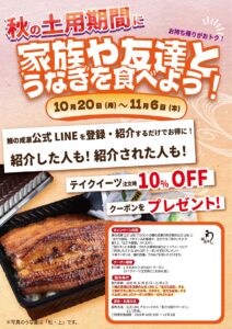 本日10月23日は「秋の土用の丑の日」! ただいま鰻の成瀬 秋の土用はみんなでうなぎを!公式LINE紹介キャンペーンを開催中です。 鰻の成瀬各店公式LINEを登録・紹介するだけで、紹介した人も、紹介された人も オンライン […]